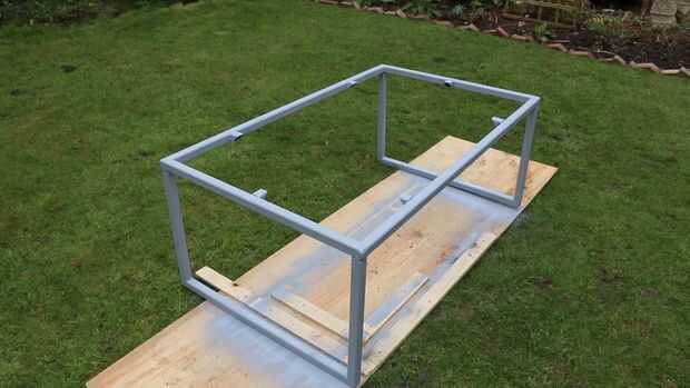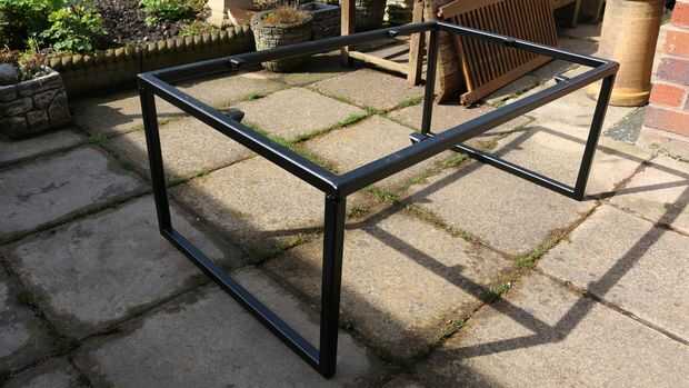 el marco de esta mesa de centro se hace de la madera contrachapada. se podría ser "pelado" con casi cualquier material. Esta es la segunda vez hice esta pieza. la primera i utiliza finos corto "retazos" de madera recuperada y montado s