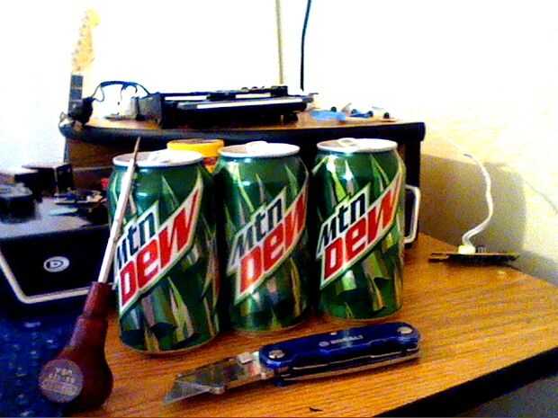 Usted también necesitará dos latas vacías de pop, tengo tres en la foto, porque yo estaba bebiendo de uno mientras que trabajé (trabajo muy sediento que sabe usted).