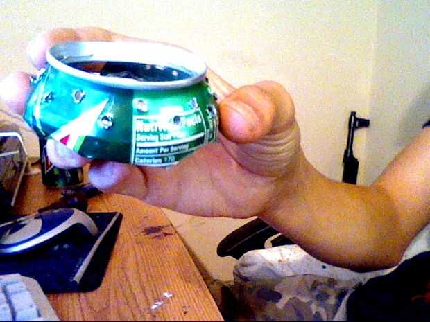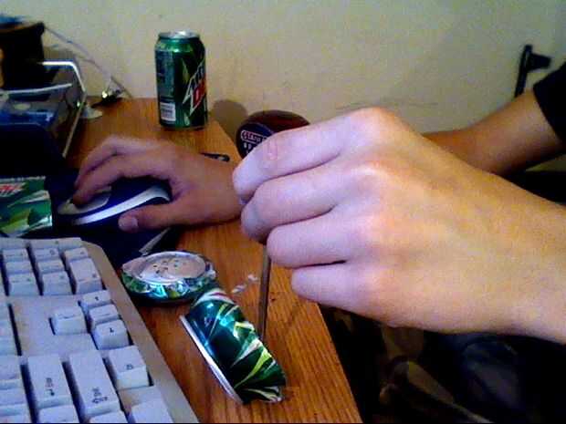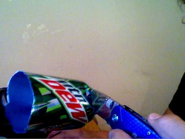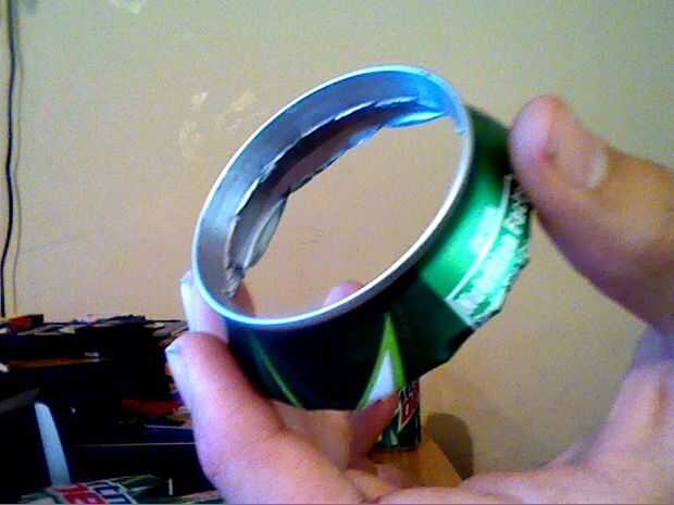 Ahora toma el martillo y hacer una abolladura en la parte inferior, que es como nivel como usted puede conseguir para que va a quedar mejor vertical. También usted puede querer hacer una agarradera adjunto... solo cortan la parte superior de una de las latas que utiliza, en donde empieza a inclinarse hacia adentro. Ahora utilizar un abrelatas o una navaja para cortar la parte superior. A continuación, tu va a querer forzar sobre la estufa, acaba de (no muy duro de grueso) en la mía, porque es difícil conseguir en. Ahora probablemente rasgó (costumbre si no importa) en el mismo lugar, pero que está bien, lo hará más fácil de. ahora quitarlo y hacer una línea de agujeros justo debajo de la llanta 3/4 de pulgada aparte, justo debajo que pone más agujeros en el medio.
