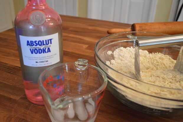 4) agregar la mezcla de agua/de la vodka, dos cucharadas a la vez, mezclando con un tenedor, espolvorea el agua en la masa.