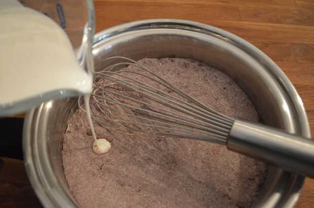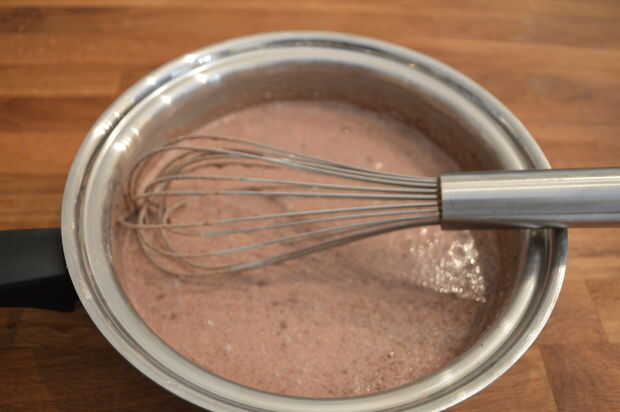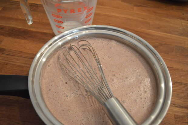 3) Coloque la cacerola sobre fuego medio y poco a poco batir en la leche.