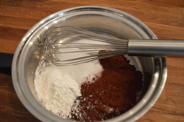 2) en una cacerola mediana lejos del calor, batir el azúcar, almidón de maíz, cacao, café y sal. Batir crema de leche fría hasta que la mezcla es suave, con sin grumos. Batir las yemas de huevo.