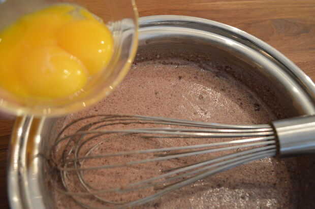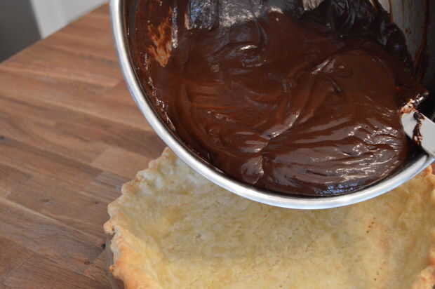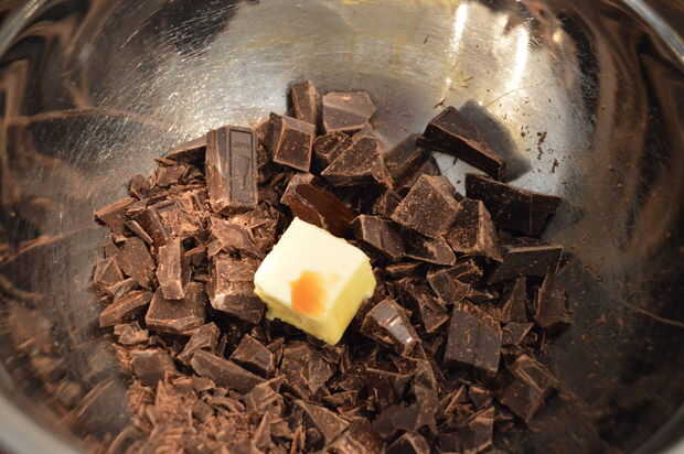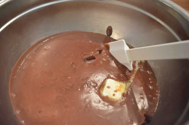 5) Retire la cacerola del fuego y vierta la mezcla sobre el chocolate reservado y la mantequilla.