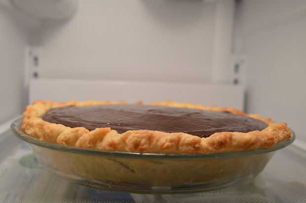 7) lugar plástico wrap o con mantequilla pergamino en la superficie para evitar la formación de una piel.  Deje que se enfríe durante 20 minutos y luego se transfieren a enfriado de la tarta.  Top liso de pie.  Refrigera el pastel durante 2 horas o toda la noche para establecer el relleno de chocolate.