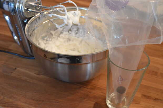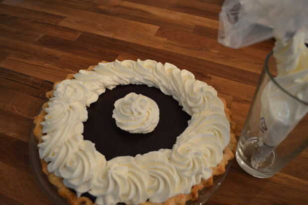Utilizando una manga pastelera con una punta de tubería grande, llenar la bolsa con crema batida. Utilizar un vaso para ayudar a sostener el relleno bolsa de crema batida. Usando movimientos circulares, agitar la nata encima de la tarta.