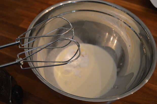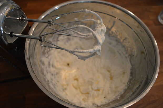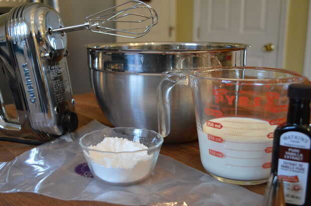 1) colocar la crema en un tazón frío, añadir el azúcar glas y la vainilla.