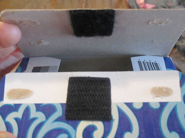 Me abrió un lado y pegado dos piezas de cojines de lazo de gancho/ojo en las aletas para permitir un fácil cierre. Cuando la caja del tejido de los tejidos, sólo abrir uno nuevo desde el lado, tire la pila hacia fuera y la transferencia en la caja de kleenex que hiciste. Fácil!!!!