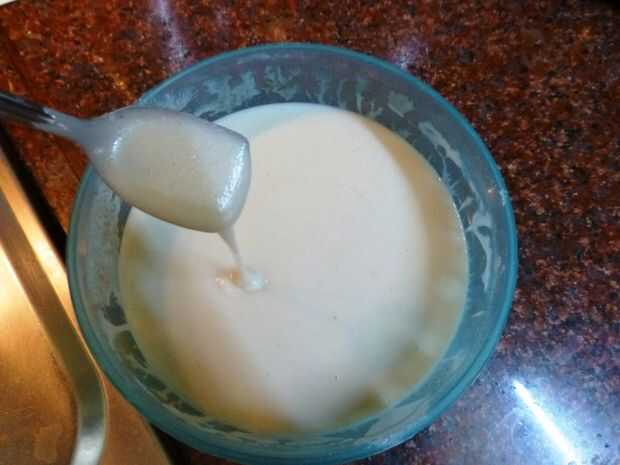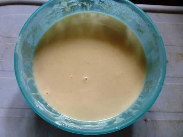 Añadir la leche de coco a la harina en el bol y mezclar bien con una cuchara. Asegúrese de que no queden grumos en la mezcla. Además, la masa no debe ser demasiado fina o demasiado gruesa y debe ser de consistencia media.