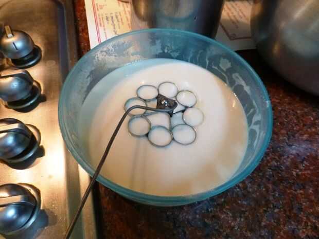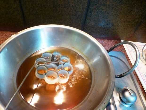 Inmediatamente después de sacar el molde del aceite caliente, sumergir en la mezcla a cerca de dos tercero profundidad del molde. No sumerja el molde en la masa. Cuando se quita de la mezcla, usted puede encontrar una fina capa de masa que se pegue al molde (ver segunda foto).