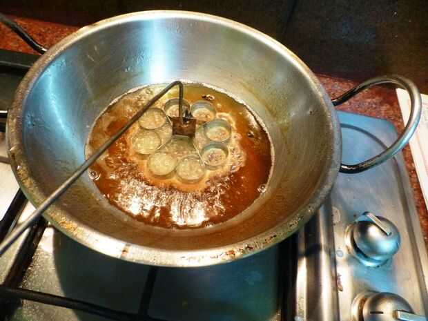 Fría la Murukku en aceite caliente sujetando el mango del molde. Mantener el aceite a fuego medio.