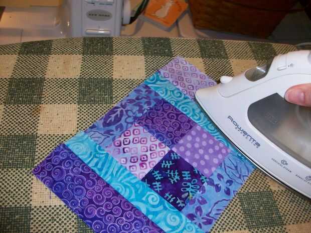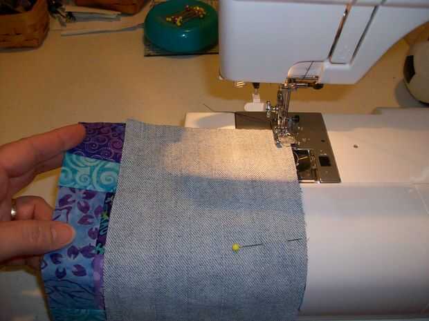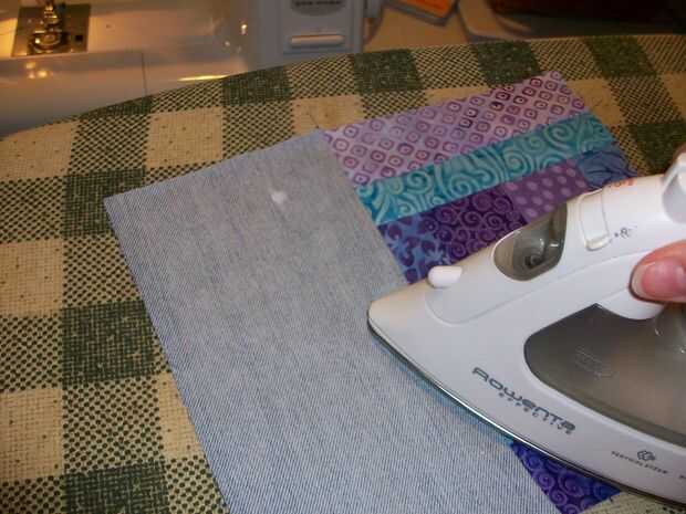 Coser juntos, usando un 1/4" cada pieza que usted ha elegido para su tejido superior de la costura. Asegúrese de hierro entre cada paso. Una vez que la parte superior es juntado las piezas Verifique que es del mismo tamaño que la pieza de revestimiento (jeans) se corta previamente. Si elige utilizar una sección unpieced de la tela en lugar de juntar las piezas de te no necesitará hacer ningún empalme, ir al paso siguiente.