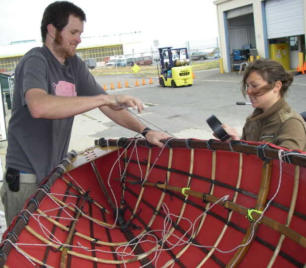 Las trincas innertube que ligan el marco estaban empezando a desmoronarse. Nos redid algunos utilizando cadena de poliéster. Es que las cintas de amarre verde brillante Lima. Entonces Ray y Chloe atar la piel en con cuerda de poliéster más grueso. Asomó cordón agujeros, pequeños cortes verticales en el dobladillo. La cadena cordón fue alrededor de la médula se refuerzan en el dobladillo y alrededor de la cañería dentro del larguero como se ve aquí.
