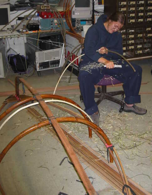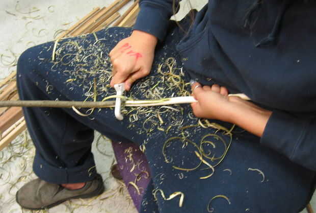 Las otras costillas son mucho más delgadas, sauce brotes 6 o 7 pies de largo cortan de un matorral. Si crecen en la oscuridad consiguen altos antes de ramificación. Luego les ató como se ve aquí y deje que se seque un poco. Danielle Smith está pelando la corteza de estas costillas con un pelador de verduras. "PLUR" escrito en su mano está parado para la "paz, amor, unidad, respeto". Tendrás que preguntar por qué. El pelador de verduras es la mejor manera de quitar la corteza. Si esperas demasiado tiempo la corteza se pone dura. Si lo hace demasiado pronto y no aceite las costillas bastante que se agrietarán, que no es realmente un problema.