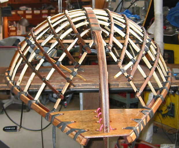 Los largueros no necesitan llegar hasta el tallo. Es mucho más fácil si no lo hacen y la forma entra en algunas curvas compuestas allí así que realmente no necesita apoyo. La última costilla en cada extremo es demasiado fuerte una uve doble, por lo que es de dos palos. Sería mejor usar palillos curvados, poniendo un poco más de volumen en la proa. Las costillas de willow eran irregulares, pero una vez azotado en una malla con los travesaños, la forma entera tiene agradable y justo. Willow no es la única especie que trabaja para las costillas, y a menos que usted está cortando cuando las hojas están hacia fuera probablemente no sabrá qué especies es de todos modos.