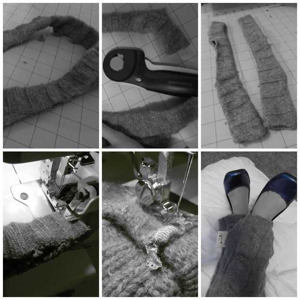 Corte dos pedazos de Jersey para terminar la parte superior e inferior de cada calentador de la pierna. Corte cada pieza para medir los extremos de su calentador de la pierna, menos 1 pulgada. El cuello o la parte inferior de tu suéter es ideal para esto porque tiene el borde acabado manufacturado. Sus extremos una pulgada menos se afilan ligeramente y mantener mejor su calentador de la pierna en la pierna.