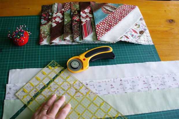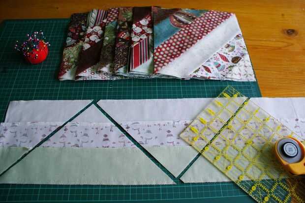 Corte 90 grados triángulos de ángulo recto del tubo. Yo uso un cortador rotatorio muy aguda y la regla de quilters. Por favor tenga mucho cuidado con esta herramienta ya que es muy filosa. Trabajar su camino a lo largo del corte tubo de triángulos (véase la foto).
