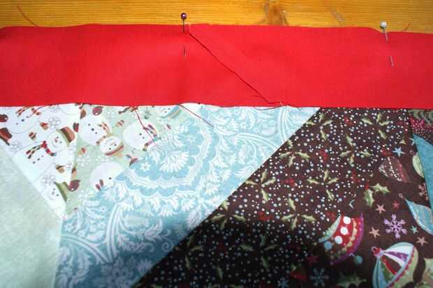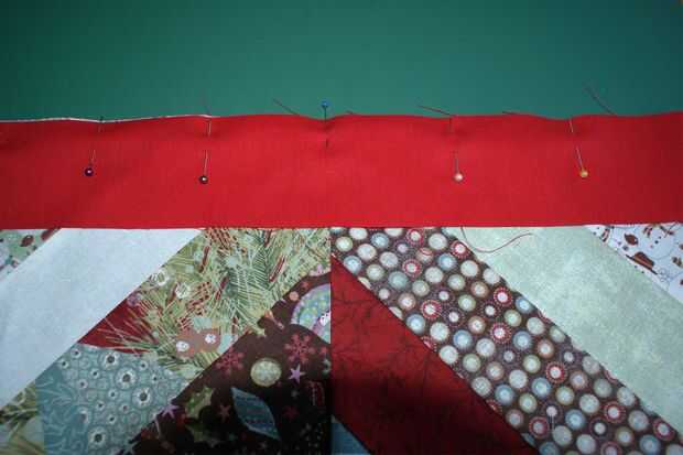 Corte seis, 2.5" de ancho tiras en tela roja para hacer la frontera. Para el lado largo de la parte superior del mosaico, dos tiras tendrá que unirse para que sean tiempo suficiente para que la longitud. Únete a estas tiras con una costura diagonal colocando las tiras en 90 grados y los de coser juntos. La frontera se coloca a lo largo de los bordes con los lados del derecho juntos (RS). Coser el borde con un regular 2/8ths de una pulgada de margen. Pulse las costuras en la parte posterior.