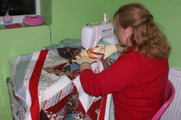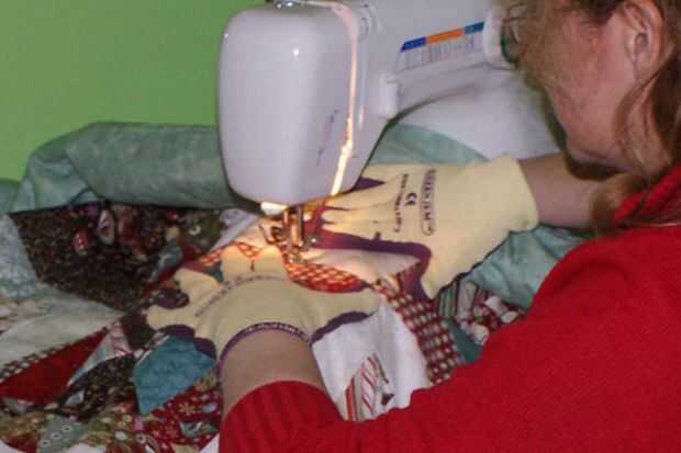 Ahora es el momento de realmente edredón el edredón! Elegí 'puntada-en-la-zanja' en esta colcha que significa derecho coser encima de las líneas de costura en la parte superior del mosaico fue cosida. Sólo uso mi pie máquina de coser normal, sino ajustar la presión en mi máquina para acomodar el espesor de las capas de tejido. Bajo mi mano derecha en la foto, se puede ver que el tejido se enrolla para ayudarla a pasar por la máquina de coser. Usar guantes de jardinería goma baratos como mis guantes de acolchar. Una vez me acostumbré a ellos los encontré esencial para quilting como que agarrar muy bien.
