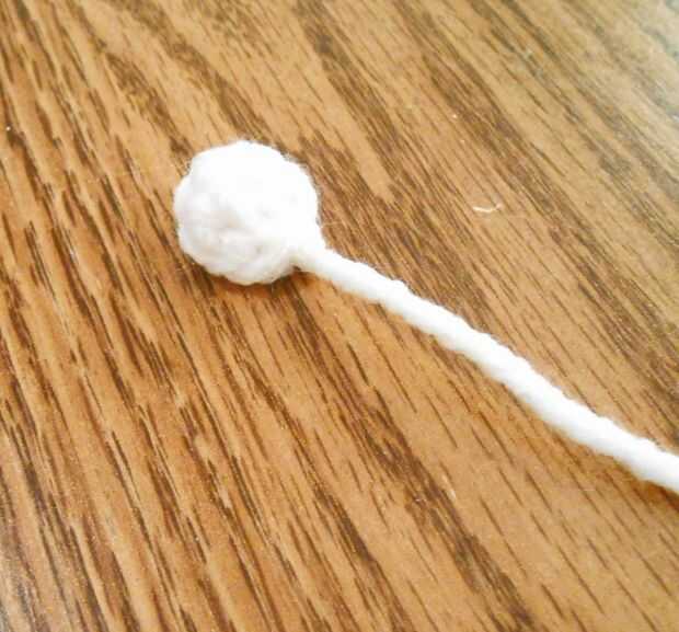 Vamos a empezar a trabajar en los pequeños malvaviscos! Me gusta hacer 3 para mi chocolate caliente, pero se puede hacer tantos o tan poco como quieras. Asegúrese de dejar una larga cola en cada uno para que se puede utilizar para coser el malvavisco sobre el chocolate.