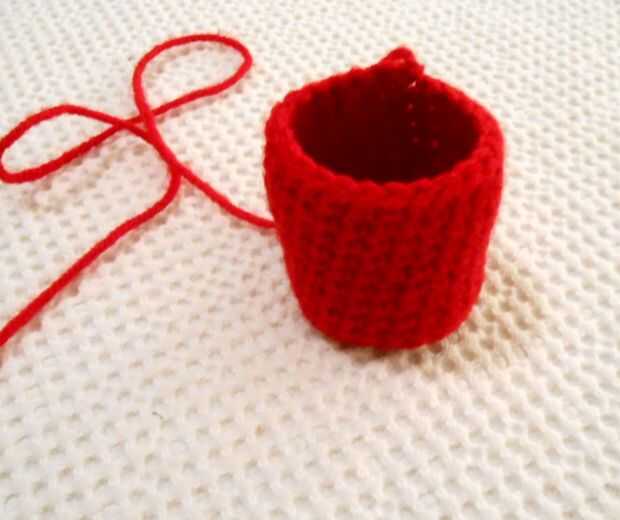 Repita el último paso 7 veces más. Deslice la puntada siguiente puntada y acabar. Deja una buena cola larga para coser el CHOCOLATE en la taza. (Segunda foto)
