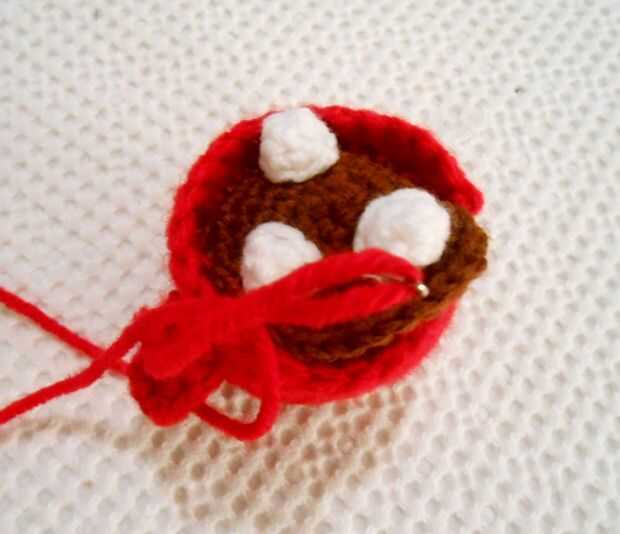 Utilice su aguja de tapiz para coser el chocolate en la taza en la segunda fila de la parte superior. Me gusta usar una puntada del azote para esto. Cuando casi han cosido la cosa entera para arriba, cosas de la taza hasta que esté firme y luego terminar de coser cerró.