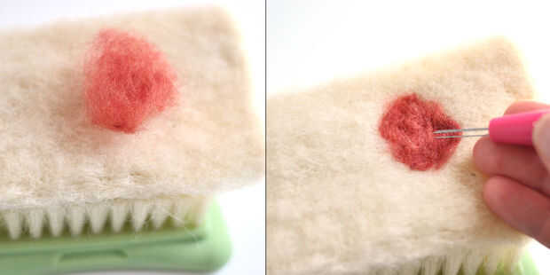 Las flores son próximas. Con un pequeño trozo de mecha, enrollamiento en forma de círculo/bola. No balanceo o guata, suavemente doblar en una forma redondeada. Poner dondequiera que usted quisiera la flor. Entonces simplemente pincharlo con la herramienta batanado de la aguja hasta que esté firmemente agarrada a la parte de la envoltura. Añadir tantas flores como parezca, uniéndolas con la misma técnica.