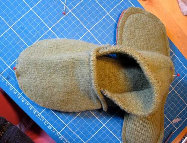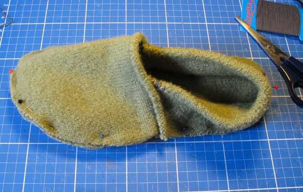 1. con la sola pieza suela hacia abajo marca el punto medio del talón y el dedo del pie extremo con pernos. Coloque la parte superior (lado derecho hacia fuera) en la planta del pie, alineando el punto medio de la pieza del dedo del pie a la planta del pie y la pieza de talón primero y luego fijar todos los bordes.