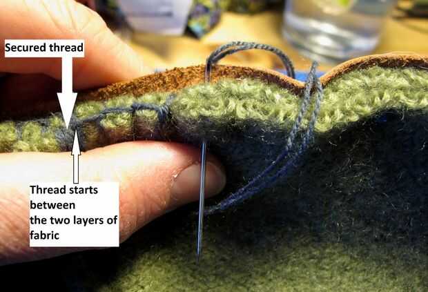 • Garantizar su hilo como antes y aplastamiento de ambas capas de tejido entre el pulgar y el índice, subir la aguja en el espacio entre las capas. (así sale en la parte superior de la costura)