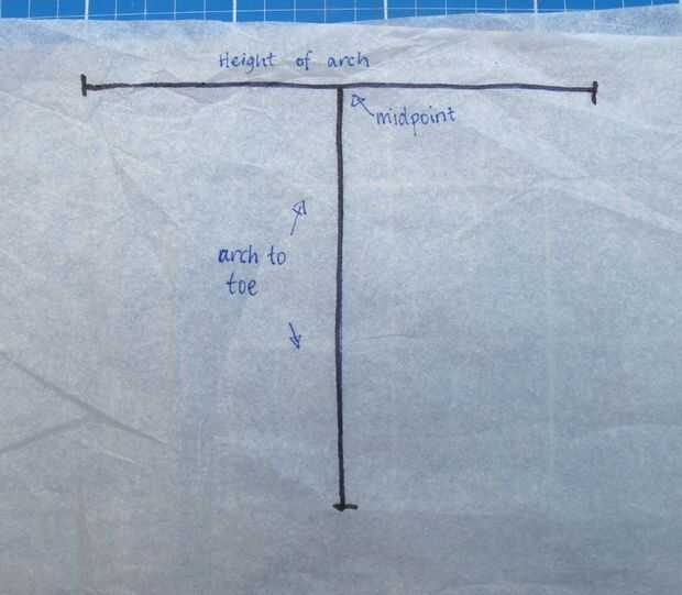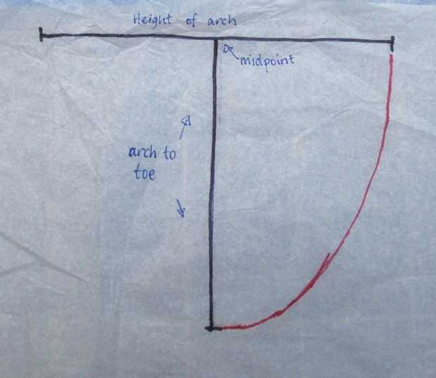 6. doblar el papel por la mitad a lo largo del arco de línea (T) del dedo del pie y dibujar una curva suave entre el final de las líneas (ver foto) corta la forma con una costura 1cm permiso todo redondo.