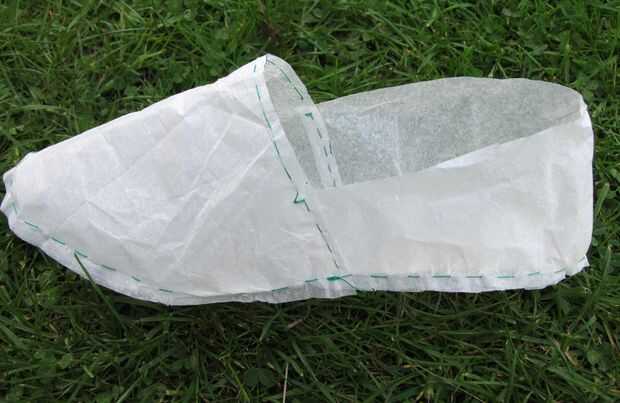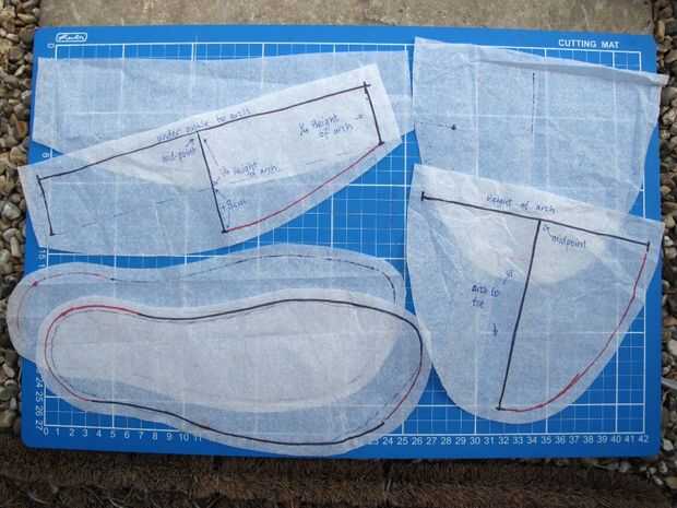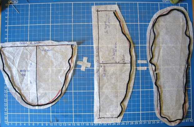La circunferencia de la línea de costura única debe ser igual a los lados curvos de la pieza del dedo del pie y del talón que suman. Puede comprobarlo utilizando lana para medir las curvas (obviamente no flojo como en esta foto!
