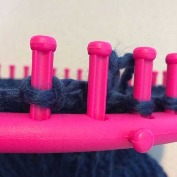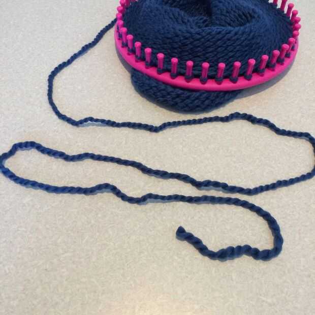 Tejer el final del hilo extra a través de cada uno de los lazos en las clavijas. Una vez que el hilo extra se rosca a través de los lazos, levante el bucle de la clavija. Continúe haciendo esto hasta que el pañuelo se separa del telar que hace punto.