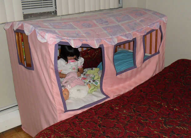 cama del niño de mi hija (pesebre convertido) está situado entre la cama y una ventana grande. Así que quería inventar algo que mantenerla protegida de cualquier proyecto desde la ventana y también sirven como algo divertido e interesante a ella para mantenerla fuera de la cama y en su propia. Tradicionalmente una de las razones se agregaron camas pabellones era mantener el calor y el frío, así que me decidí a hacer mi propia. Y aquí está, un dosel de cuna acogedora casa!