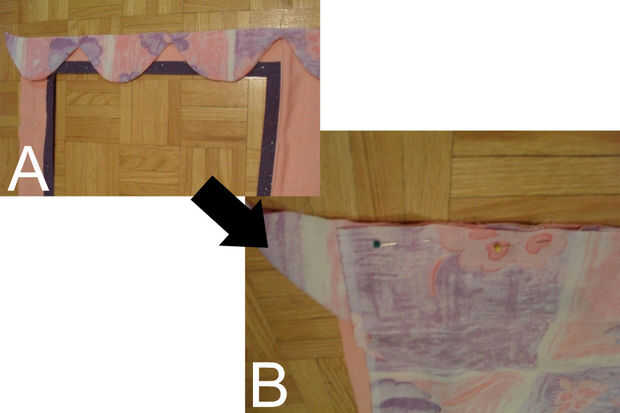B) Coloque la pieza de techo derecha hacia abajo de eso, alineando los bordes. Perno en su lugar. Recorte cualquier exceso Vieira. Coser el borde con un margen de costura de 3/8".