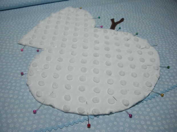 Siguiente lugar el sombrero y la bufanda también alfileres para sujetar bien, recuerde que esta formas se corta en guata de algodón. Coser con una puntada de zig zag
