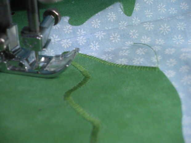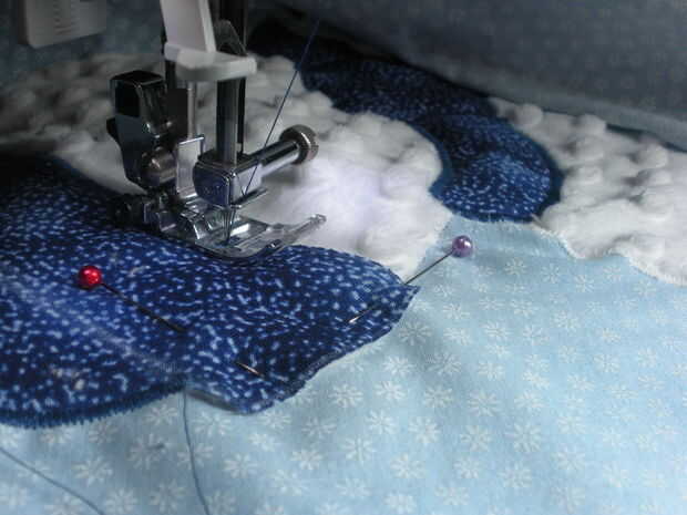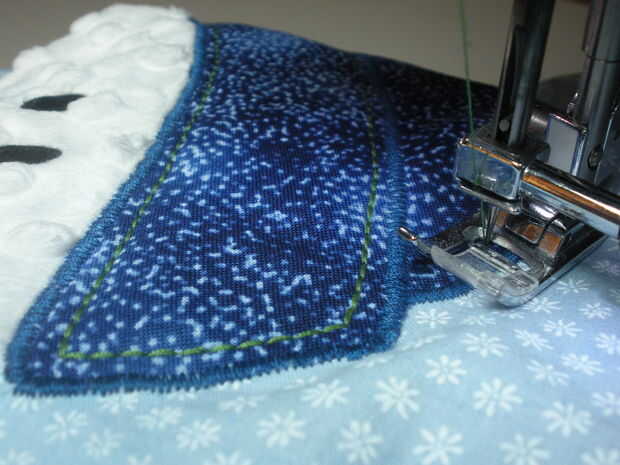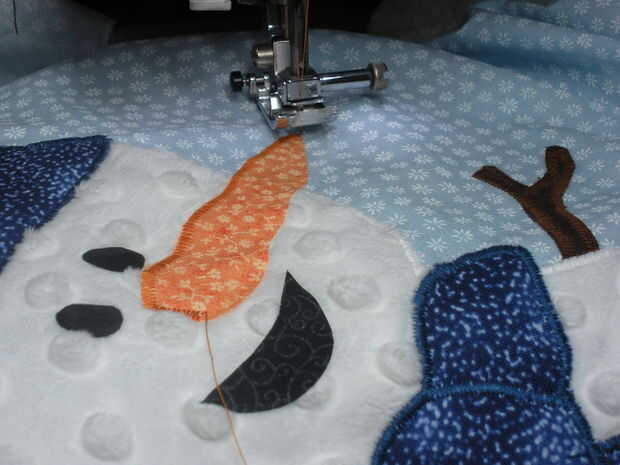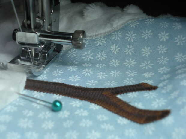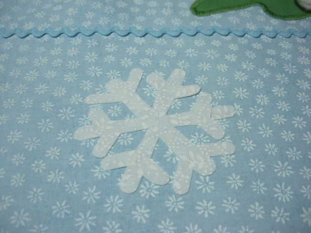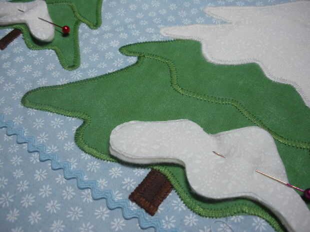 Utilizar una puntada de cierre zig zag, tómese el tiempo que necesites ir alrededor de formas intrincadas y tendrán que cambiar de hilo para cada tela o adorno. Una vez que el pino ya aplican la parte blanca (nieve) en este, pasador y terminar con un zigzag, el sombrero y la bufanda.