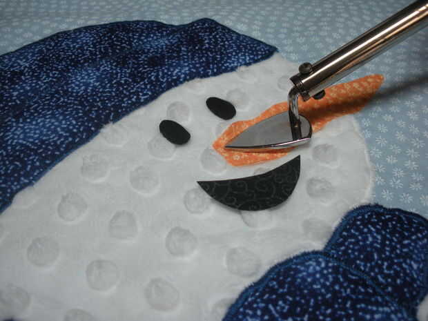 En el sombrero, la bufanda y la nieve en el árbol acabado con una tapa de costura con un color contrastante de hilo. Para la nieve en el árbol Utilice hilo de color blanco