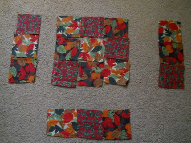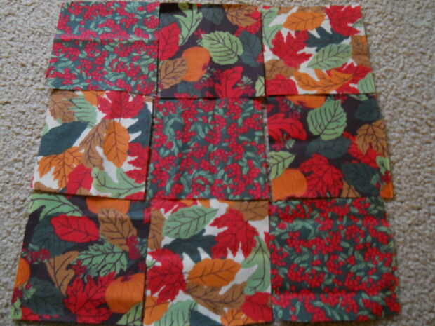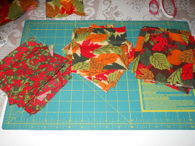 Los cuadrados que necesitará será 5 pulgadas por 5 pulgadas.  Con las 3 telas tenes, corte nueve 5 pulgadas por 5 pulgadas cuadrados de cada uno.  Es tres para la parte delantera, tres para la espalda y cada uno de los 2 lados y el fondo.  Después de cortar sus plazas, organizarlos en un patrón que te gusta.