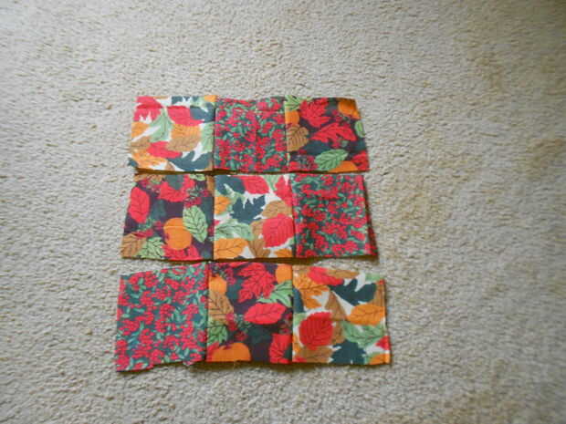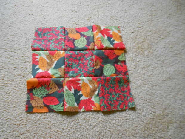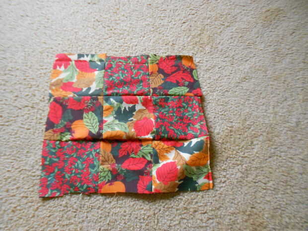 Su bolsa tendrá 9 plazas en la parte delantera y trasera y 3 plazas en la parte inferior y los lados. Para comenzar, tome la primera fila de tres plazas y coserlas juntas. Luego, coser juntos a la siguiente fila de tres plazas. Repita con la última fila, así que tienes 3 tiras de cuadrados que no están conectado. Tomar la tira superior y coser a la franja inferior. Ahora debe tener dos filas de 3 plazas, 6. Luego, tomar la última tira y coser a la fila 2 de la pieza principal. Ahora debería tener una pieza de 3 por 3 para el frente de usted de nuevo. Repita este mismo proceso para la parte posterior de la bolsa. Para los lados, coser tres plazas en el patrón deseado como se muestra en la imagen. Para la parte inferior, cose tres plazas juntos como haría para hacer una tira como se muestra en la primera foto. * Habrá una costura de 1/2 pulgada para esta parte *