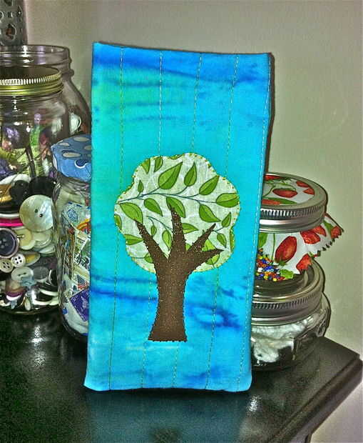 Situado en el centro delantero de este caso es un simple y elegante de mano creada apliques diseño de un árbol. La corteza de este árbol se hace de una tela marrón oscurezca que tiene un toque de brillo oro a él. La sección de hojas del árbol se hace de la misma tela con motivos naturalista que fue utilizada para el revestimiento. Todo el camino alrededor del borde exterior de la aplicación son puntadas pequeñas que tenían a mano cosido para asegurar que cualquier peeling no ocurriría, incluso después de desgaste a largo plazo. Los puntos alrededor de la corteza se hacen en hilo de bordar marrón oscuro, mientras que luz hilo verde fue utilizado por la sección de hojas del árbol.