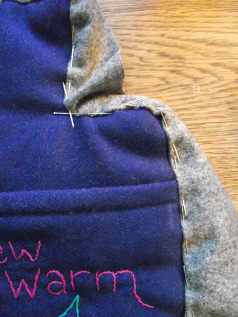 Para evitar ver un borde, doblar el borde de la tela gris sobre antes de la fijación a la cubierta - es un poco incómodo, pero vale la pena. PIN en todo el camino alrededor de la parte delantera de la cubierta y tire alrededor y pin todo el camino alrededor de la parte posterior de la cubierta (recordando a doblar sobre el borde para que sea aseado.