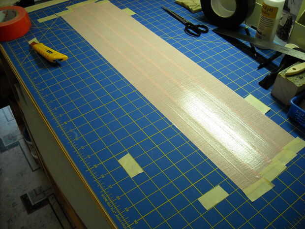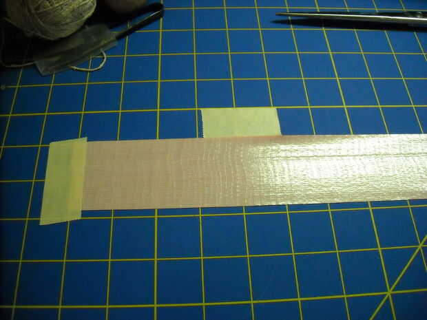 Mide la espuma decidió hacer esta capa de cinta de aproximadamente 2 pulgadas de más en cada uno de los lados largos y cerca de 4 pulgadas de largo bien. La cinta tiene que ser presentado lado pegajoso hacia arriba y sólo utilizo un trozo de cinta adhesiva para sostener los extremos hacia abajo.