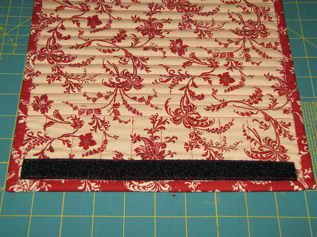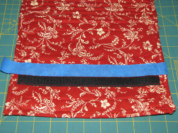 Cortar la cinta de velcro a 9,75" de largo.  Coser una pieza en el borde de la aleta del lado del forro.  Marcar donde se encuentra con la parte posterior de la caja cerrada (yo uso cinta).  Coser la pieza correspondiente de velcro en la parte posterior donde se marcó.