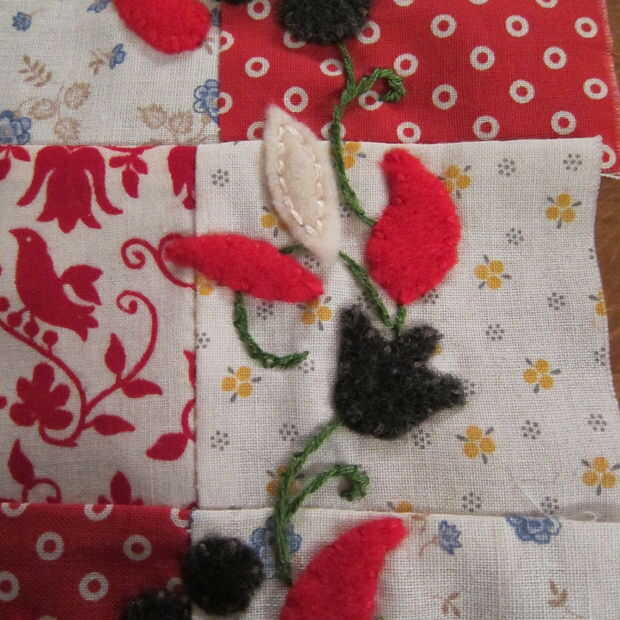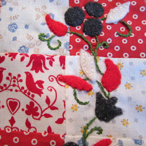 Cortar formas de fieltro y colocar en un panel. Coser el fieltro en el panel con hilo. Bordar la tela para hacer las hojas de la hierba y vides para conectar los elementos de la flor.