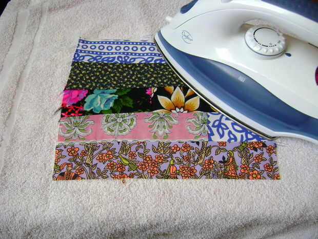 1. colocar tu franjas encarando los derechos. 2. coser las tiras junto con al menos un margen de costura de 1/4 de pulgada. 3. plancha la Plaza acabada por lo que el bloque se pone plana.