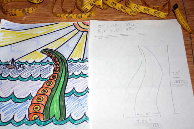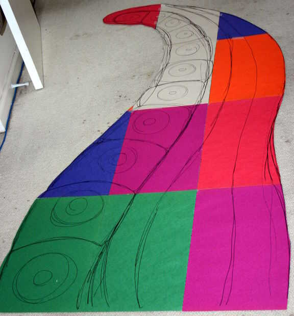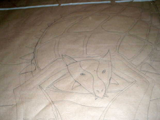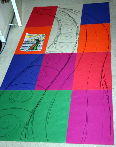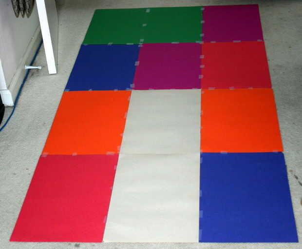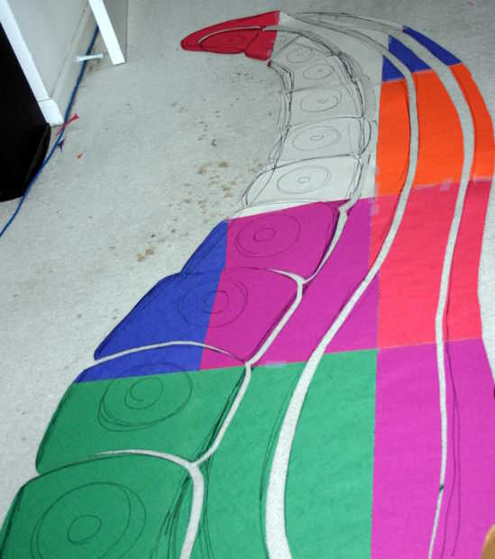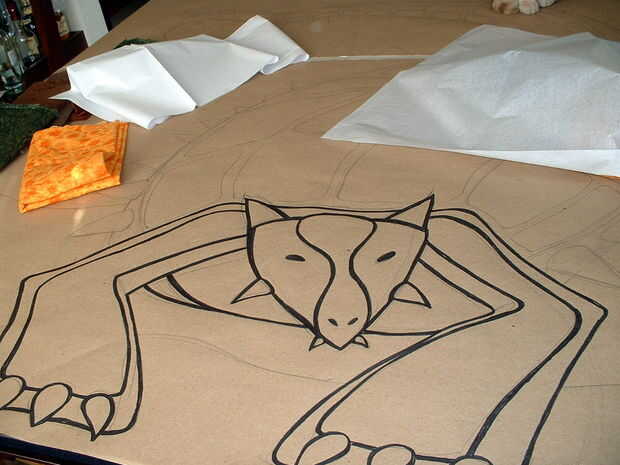 También, si no tienes un pedazo de papel lo suficientemente grande, entonces usted puede cinta trozos más pequeños según sea necesario para formar una superficie de dibujo. También puede dividir el diseño en unas pocas piezas para que sea más manejable; el punto es simplemente tener el patron tamaño final para guiarlo. Una vez que tenga un patrón de tamaño completo puede cortar aparte por región del color deseado y finalmente utilizar estas plantillas de papel para guiar el corte de las piezas para la tapa del edredón.