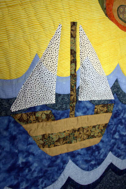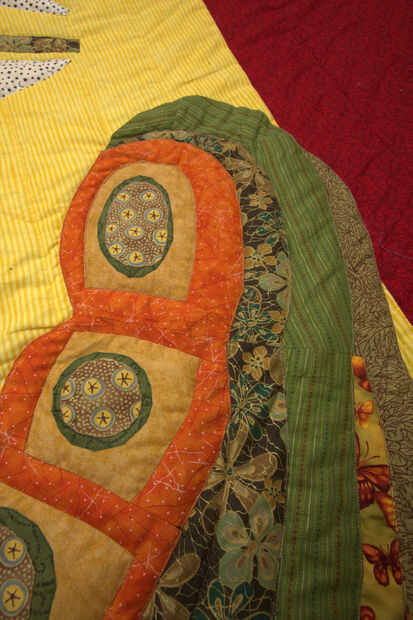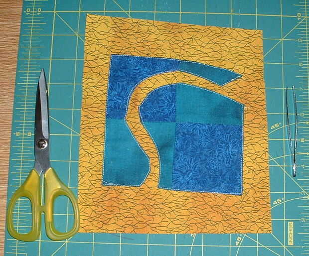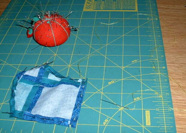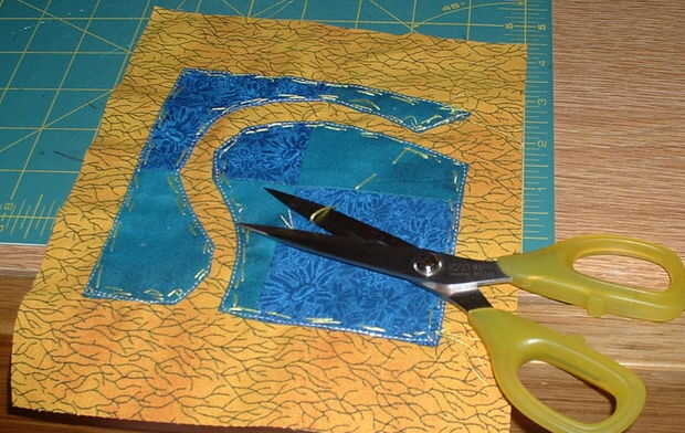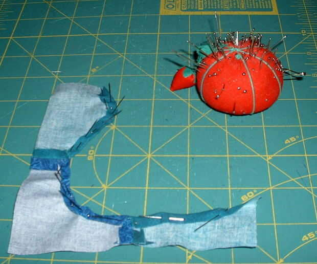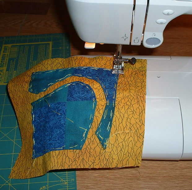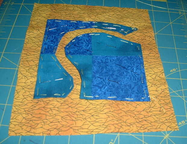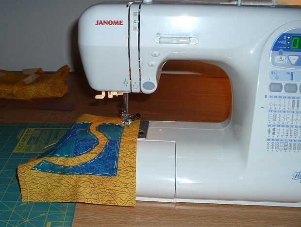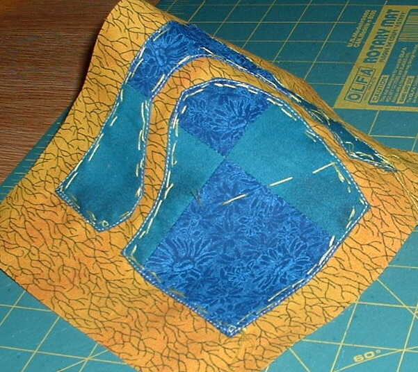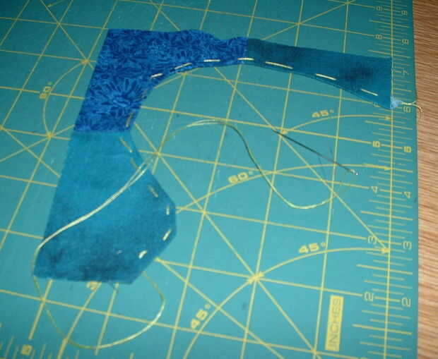 Para hacer un aplique primero corte a la tela a la medida, dejando margen para un dobladillo. A continuación doblar dobladillo bajo y, plana y plancha la forma, luego uso hilvanado suturas (puntadas largo sueltos cosidos a mano para eliminación posterior) para fijar la costura. Técnicamente podría omitir este paso y usar alfileres, pero encuentro que pueden tirar alfileres la tela ligeramente desalineada, son difíciles de coser sobre, y con frecuencia asoman y me rasguño mientras se trabaja con cosas con una gran cantidad de pernos en ellos. Una vez listo poner la forma del excedente existente trabajar y coser con mucho cuidado el borde hacia abajo, está como cerca de la frontera como usted puede.