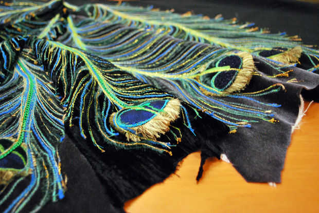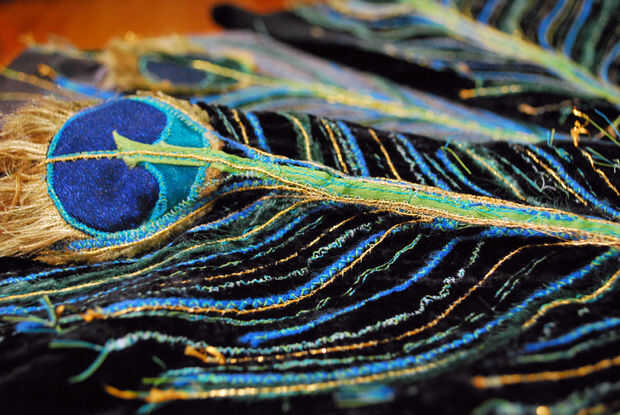 Después he terminado con las espinas me voltee el ventilador de la pluma y ver qué efecto el relleno tiene. La primera foto muestra la elevada columna y ojo. Hasta ahora he agregado dimensión, pero las hojas de la pluma cierta profundidad y vida también necesitan. La segunda imagen muestra cuánta tela extra que está entre cada pluma. Acolchado selectivamente las hojas le ayudará a tomar esa tela sobrante. Ahora es un buen momento para averiguar qué frondas quiero destacar! Sobre todo estoy eligiendo con adornos de oro, ya que tan bien te capturan la luz. Pero no quiero el oro de hojaldre exclusivamente porque las plumas se ven demasiado incluso.