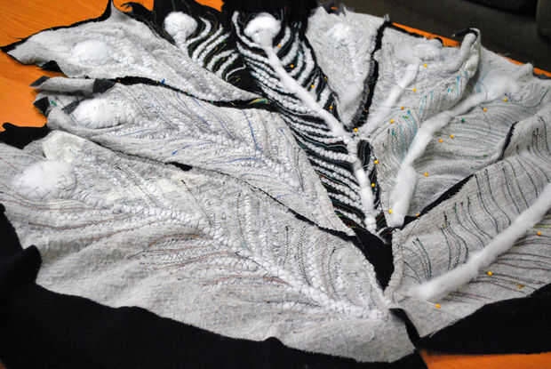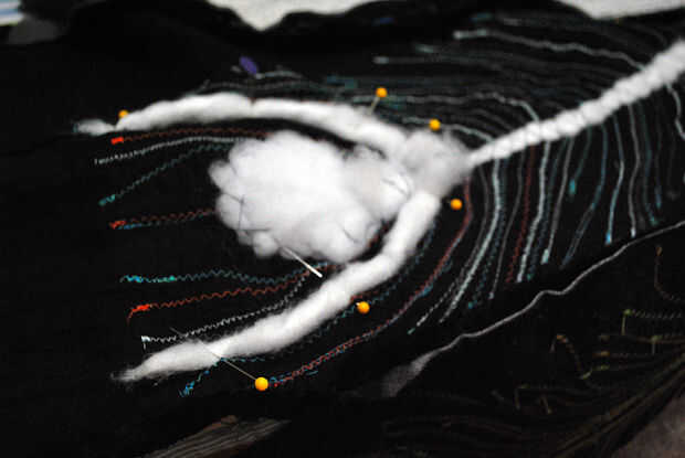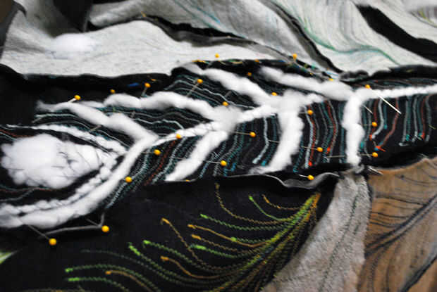 Me gusta pensar en este proceso como dejar que la tela me dice lo que quiere hacer. Por supuesto la tela no realmente me hable o yo estaría preocupado. Pero cada vez a que he acolchado una sección, burbujea la tela adicional en diferentes áreas para ayudar ver donde debe ir la siguiente pieza de relleno. Trabajo para cada sección de la pluma razonablemente suave, con la mayoría de la tela sobrante en cada segmento por mi acolchado.