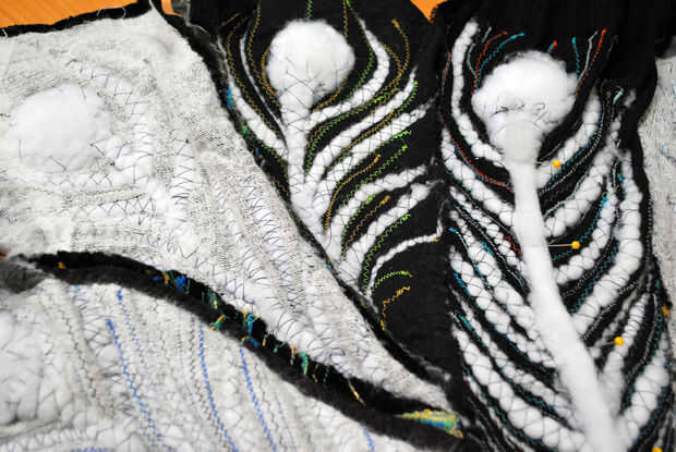 Llene cada columna donde hay chuletas y bultos con giros largos de bateo. A veces es más fácil de rellenar la columna una segunda vez y a veces sólo necesita rellenar áreas pequeñas. Pin el bateo en lugar en cada puntada de la espina dorsal y la cruz hacia abajo, luego pasar a la siguiente área. Enciendo el ventilador de la pluma periódicamente para comprobar mis progresos y ver lo que otros agujeros deben llenarse.