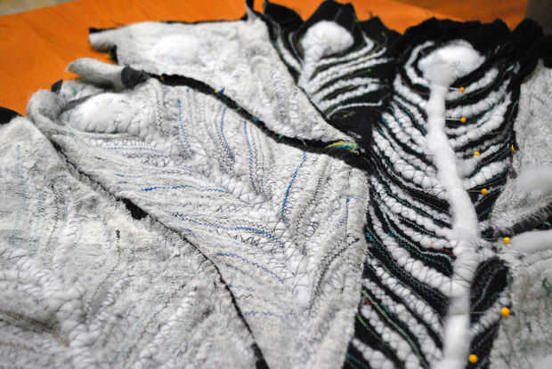 Las costuras están acolchadas en acerca de la misma manera que las espinas. Me arrancar largas tiras de bateo y los ponen en el lugar en cada costura. Entonces pin el margen de costura sobre el bateo y Cruz la puntada hacia abajo. Algunos son extra anchos y que deba ser rellenado en ambos lados, pero la mayoría de ellos son perfectamente hinchada con un toque de bateo cada uno.